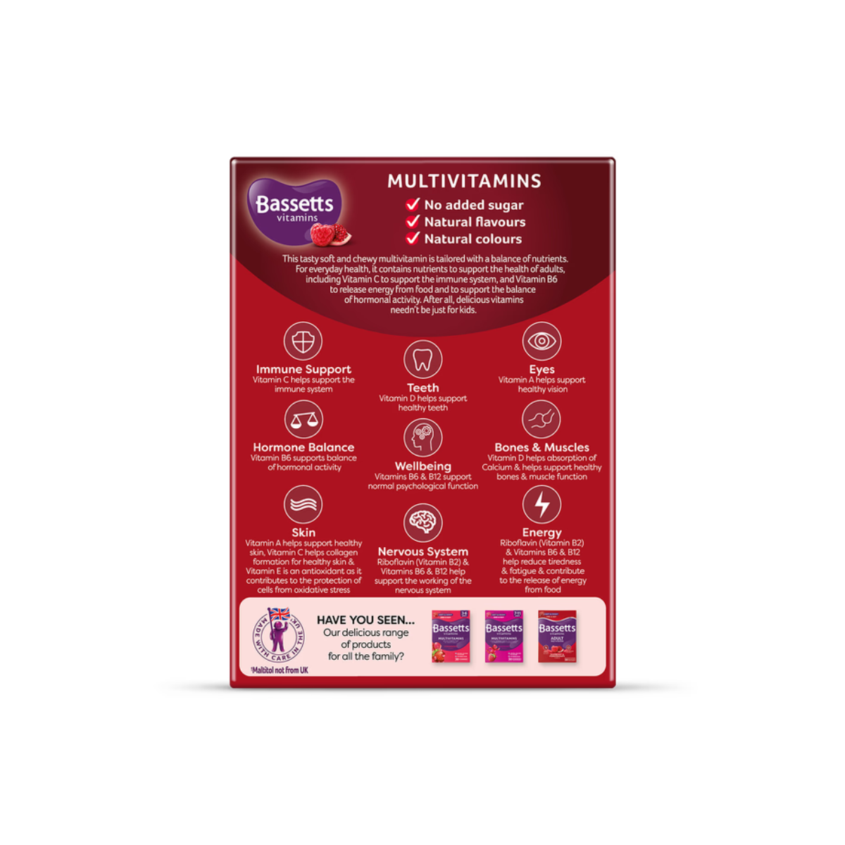 Do not take Vitamin A supplements if you are pregnant or planning to become pregnant in the near future, except on the advice of a doctor. Contains Maltitol and Sorbitol which are polyols – excessive consumption may cause a laxative effect. Food supplements should not be used as a substitute for a balanced, varied diet and healthy lifestyle. Not suitable for children under the age of 12. KEEP OUT OF THE REACH OF CHILDREN.