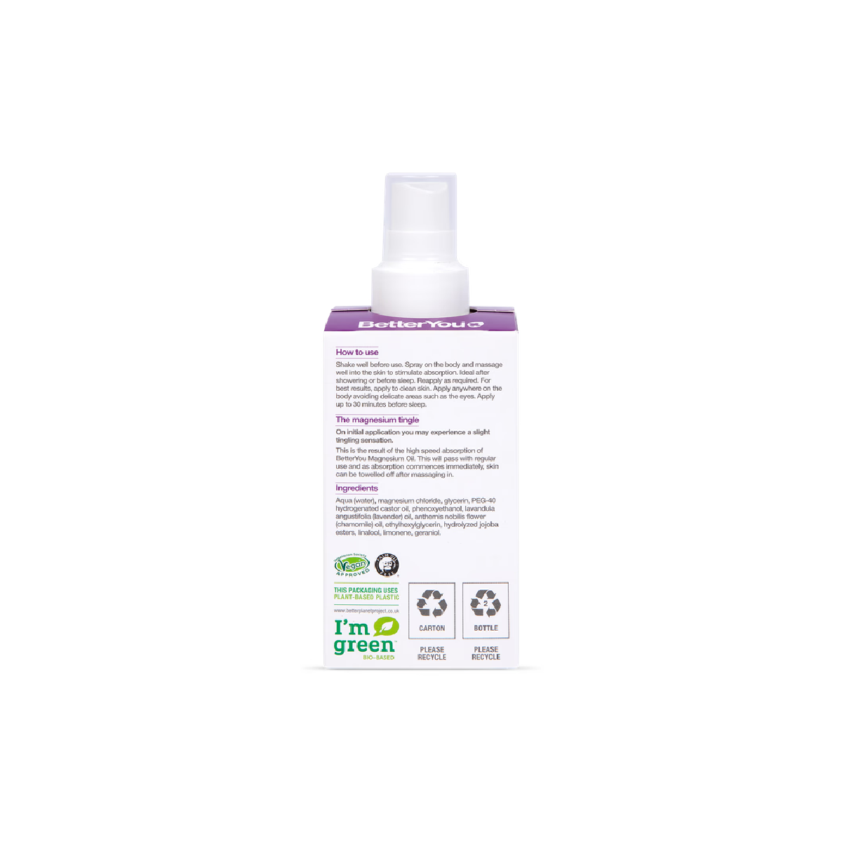 BetterYou Magnesium Oil Sensitive spray contains only 100% natural magnesium and has been dermatologically tested to ensure suitability for even the most sensitive of skin. It is the ultimate way to replenish magnesium levels. 10 sprays deliver a minimum of 75mg (21.5% NRV) of optimally absorbable elemental magnesium. Magnesium is a vital mineral with many therapeutic benefits. It helps promote overall well-being and relaxation, skin health and skeletal strength.